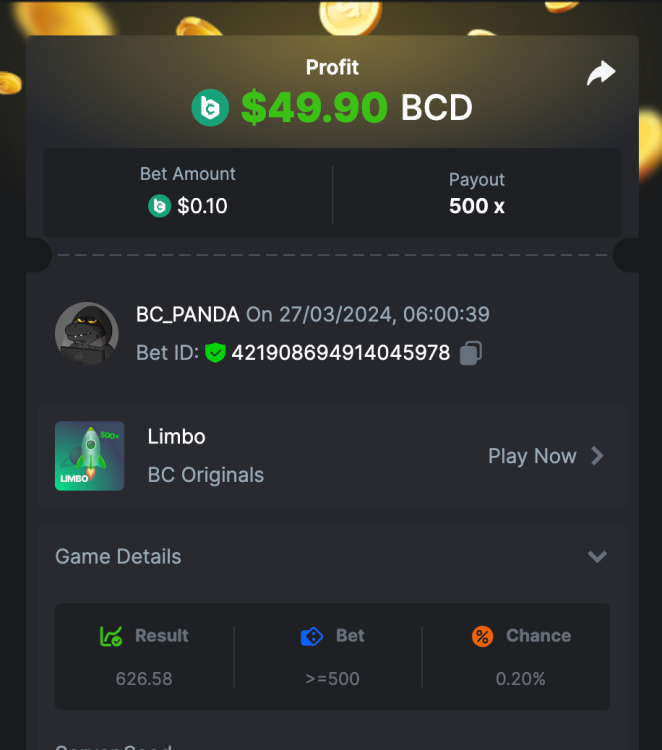 1. Description: Golden Week Twist ∞ 500X The event kicks off at 00:00 (UTC+0) on April 29, 2024, and wraps up at 23:59 (UTC+0) on May 5, 2024. Extra winnings for qualifying participants will be announced and credited within 3 working days post-event. During the event, place a minimum bet of 0.1 USD or its equivalent on Twist. After each successful bet, submit your "Betlink" via the BC Form. Every qualifying player has the opportunity to earn an additional winning amount of x2, capped at 100 USD for a single player. Read More: https://bc.game/promotion/c3cdcae660a3319 Congratulations! We hope you had a fantastic time. We wish you the best of luck in future events, don't forget to join more exciting events at BC.GAME! Winners List: No. User ID Reward 1 32***17 $ 100.00 2 18****53 $ 100.00